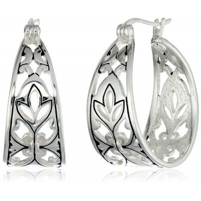 Sterling silver hoop earring with flared silhouette featuring elaborate filigree cutouts
